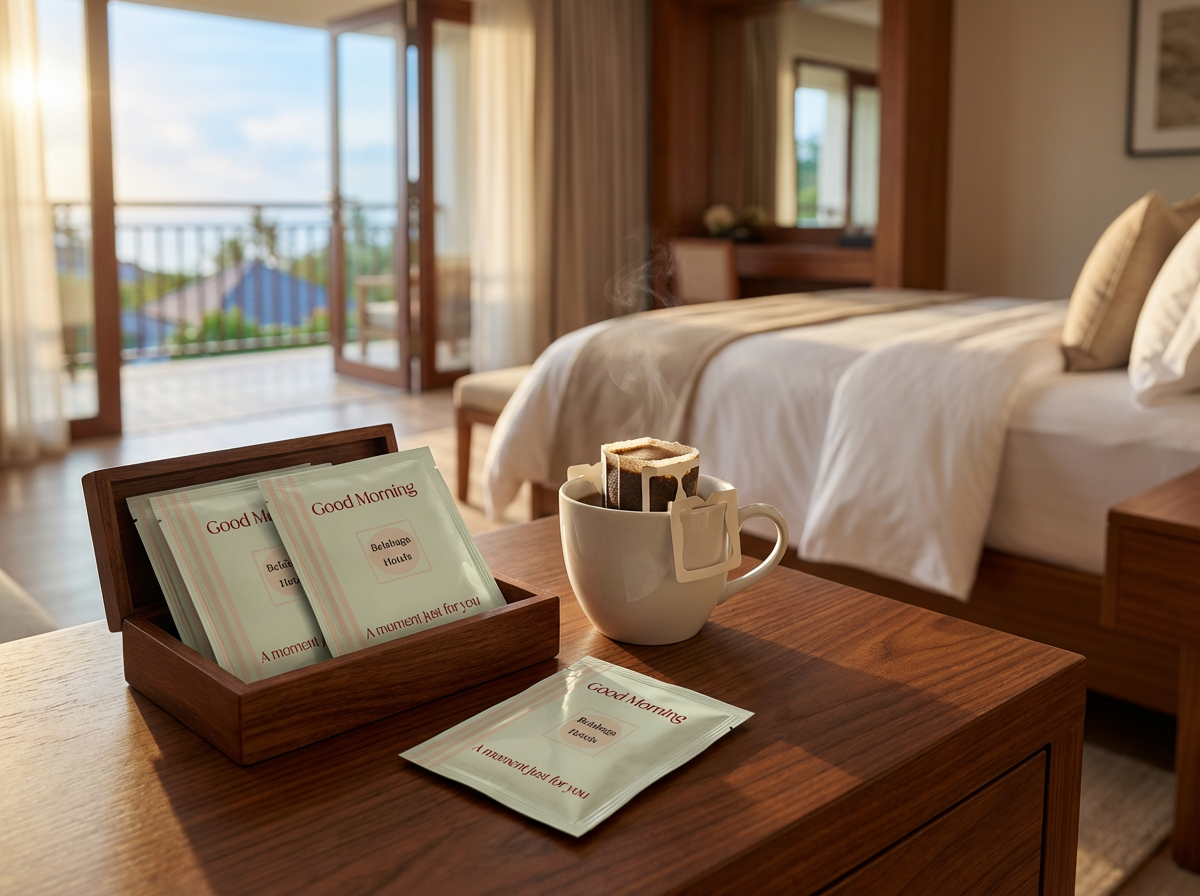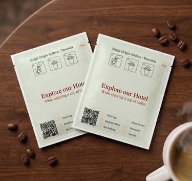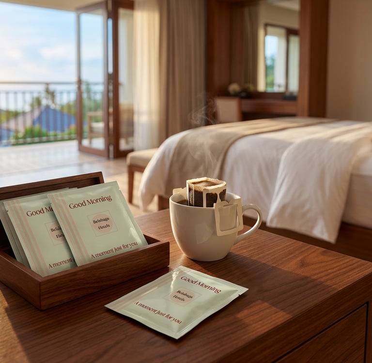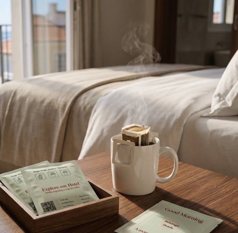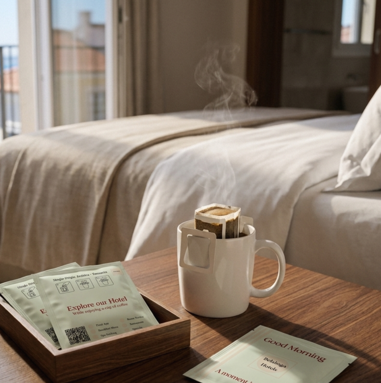 The moment a guest walks into their room sets the tone for everything that follows. A personalised drip coffee bag on the desk - with your logo, your story, your touch - creates a guest experience worth writing home about.