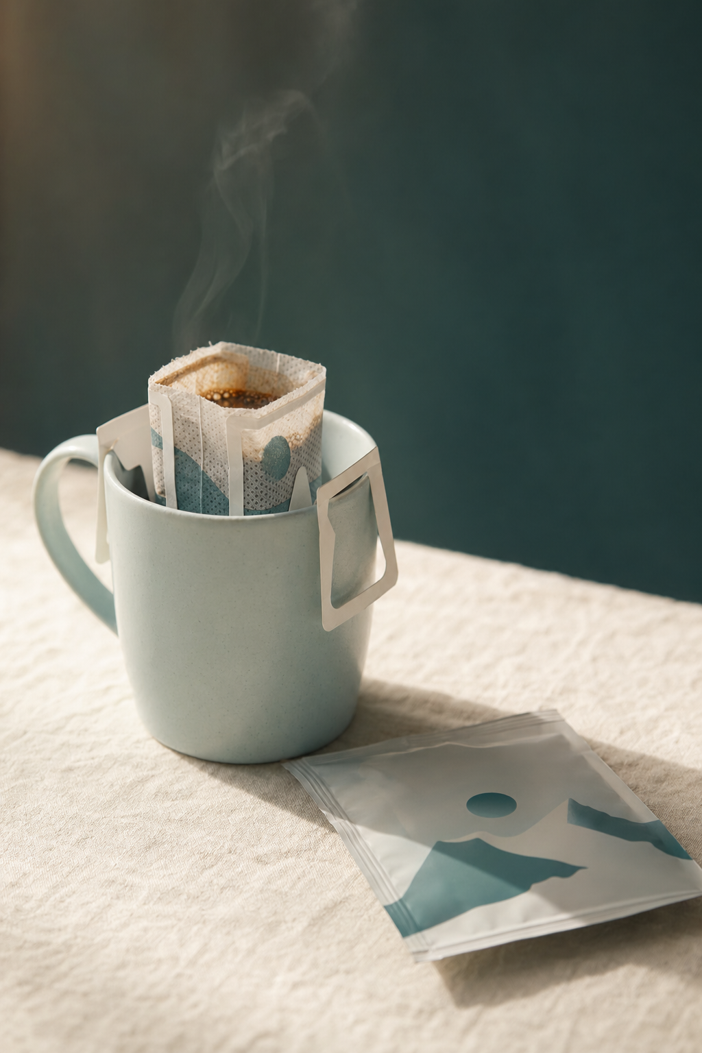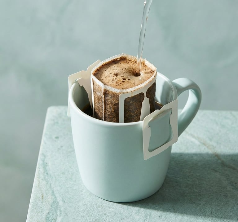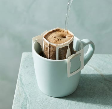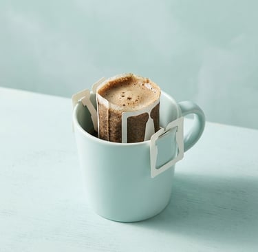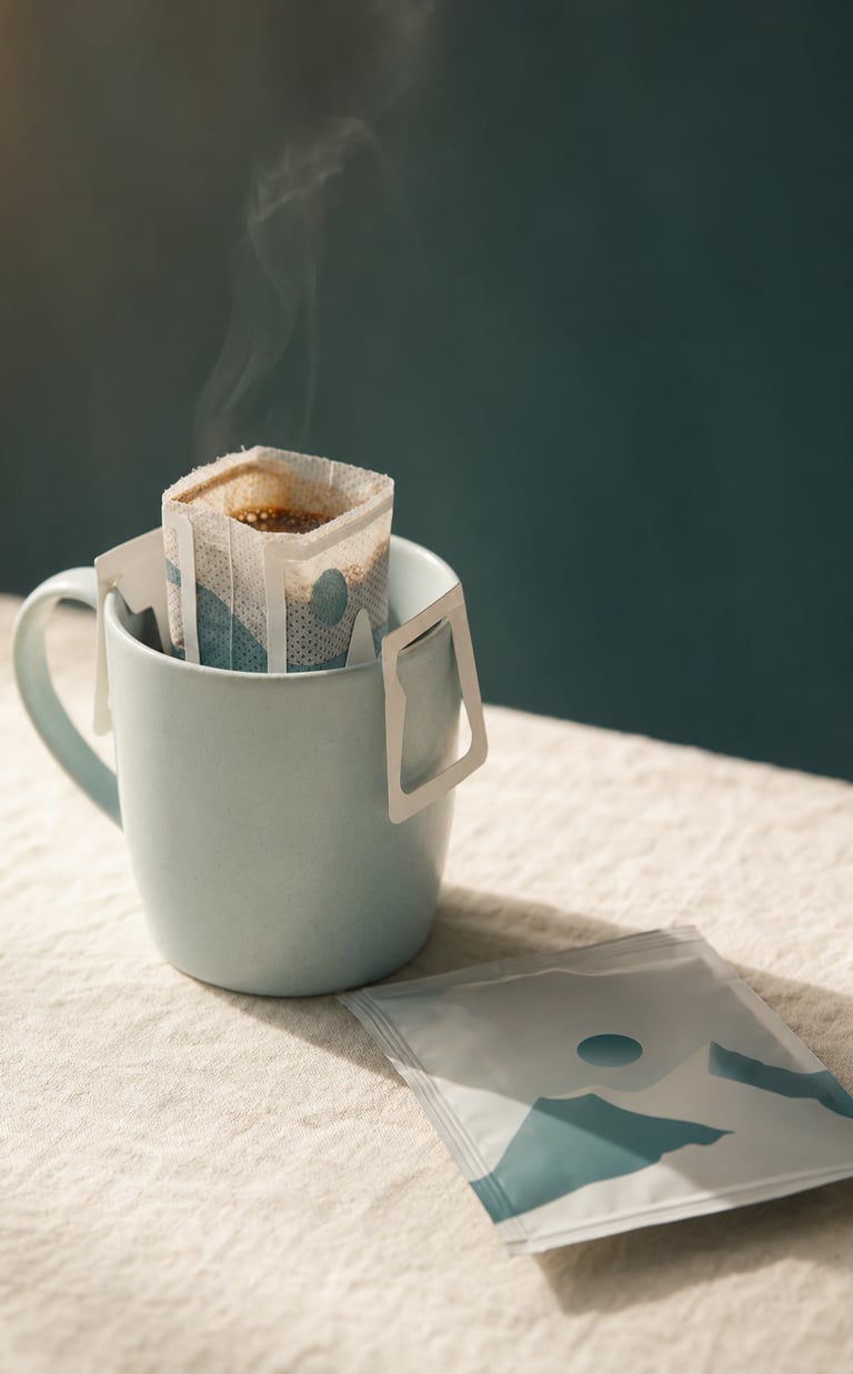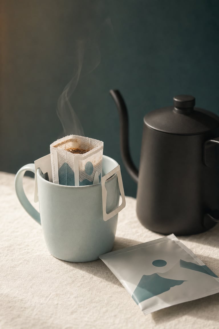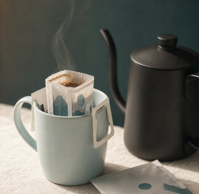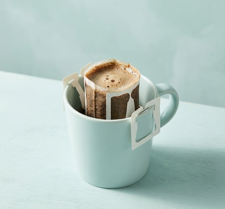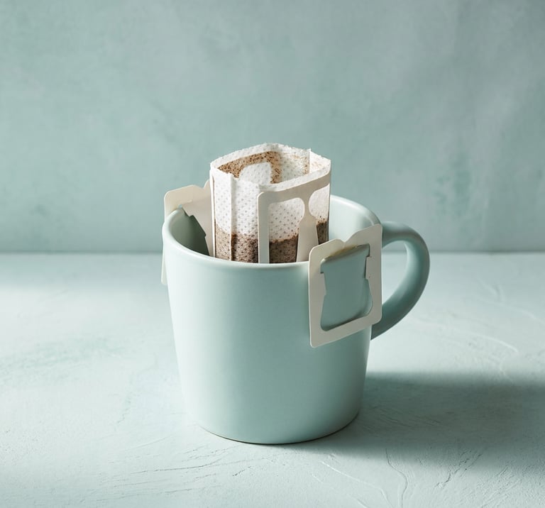A drip coffee bag is a single-serve filter filled with freshly ground specialty coffee, with two fold-out paper wings that hook over the rim of any mug. You pour hot water over it, wait a few minutes, and lift it out.